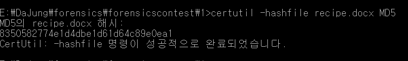- cmd에서 certutil -hashfile [filename] [Hashalgorithm] 명령어를 이용하여 MD5를 구한다.