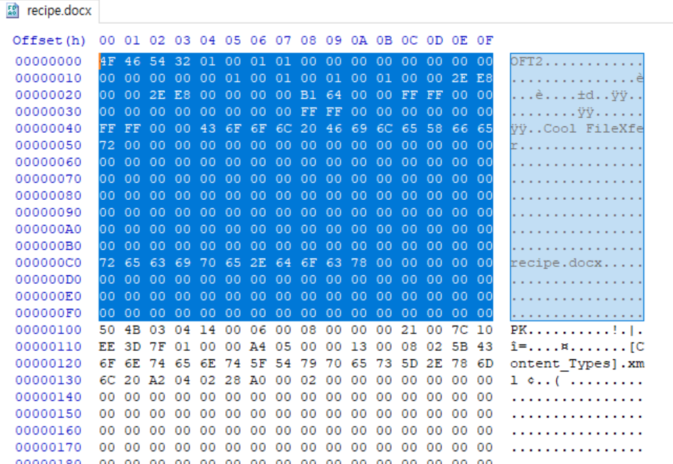 - 중간쯤 보면 recipe.docx라는 문자열이 파일이름인 것을 알 수 있다.