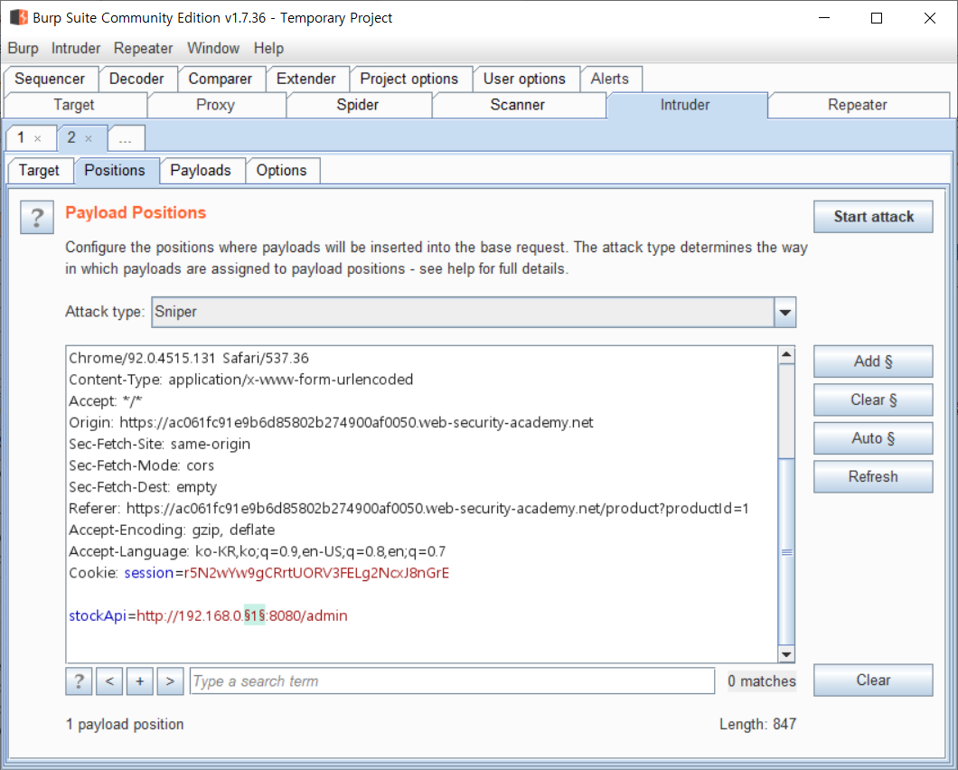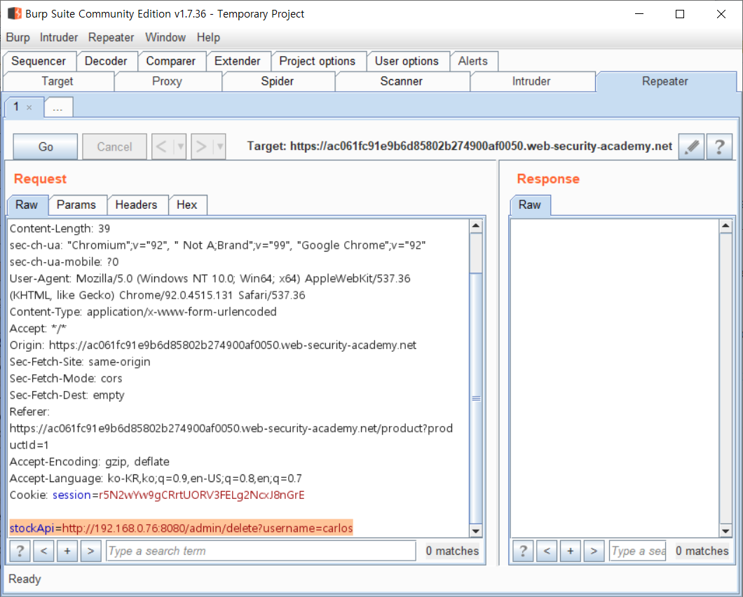 저번 문제와 똑같이 내부 재고 시스템 기능을 사용하여 192.168.0.X 범위내에서 포트 8080 admin계정에 접속하여 사용자 carlos를 삭제해야 한다.